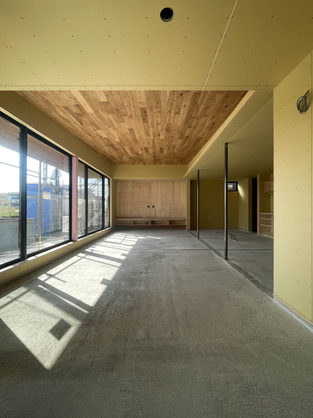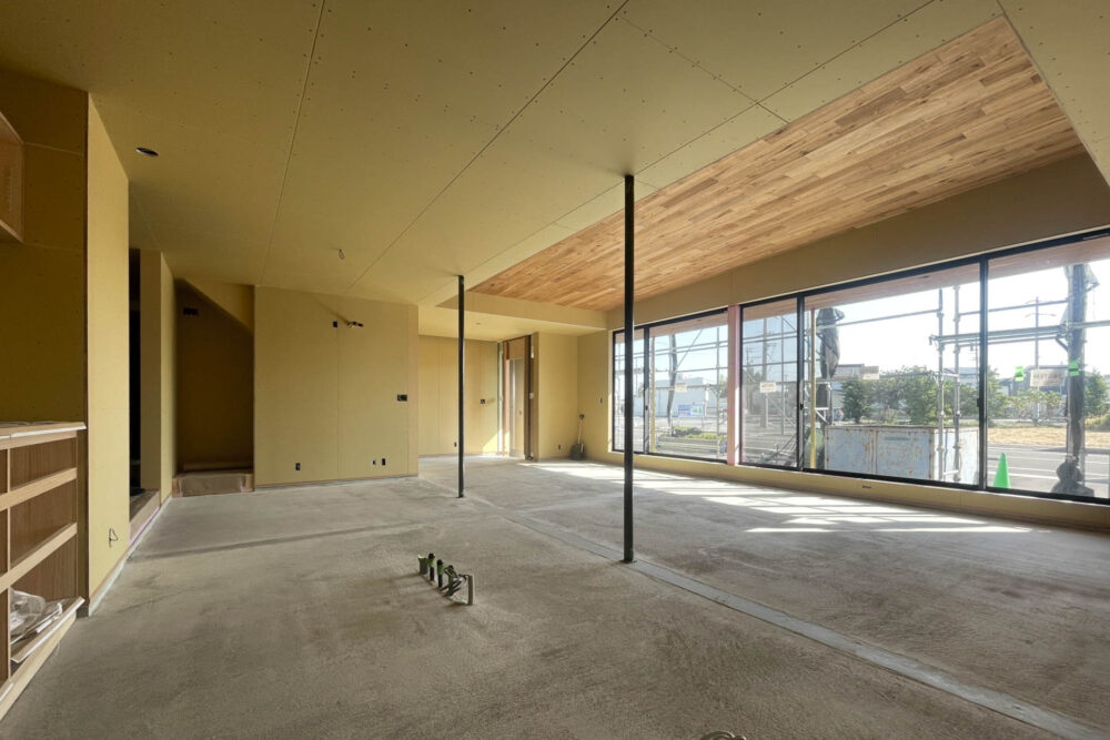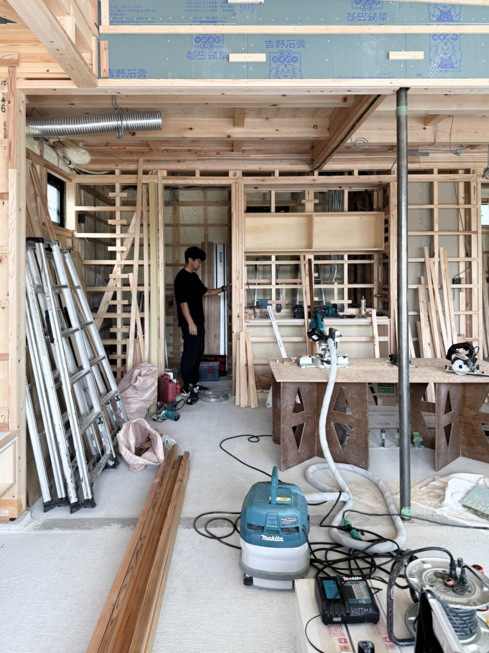今後、キッチンと丸柱の養生を外したら、木の比率が大きくなり自然の温もりも強調されることでしょう。