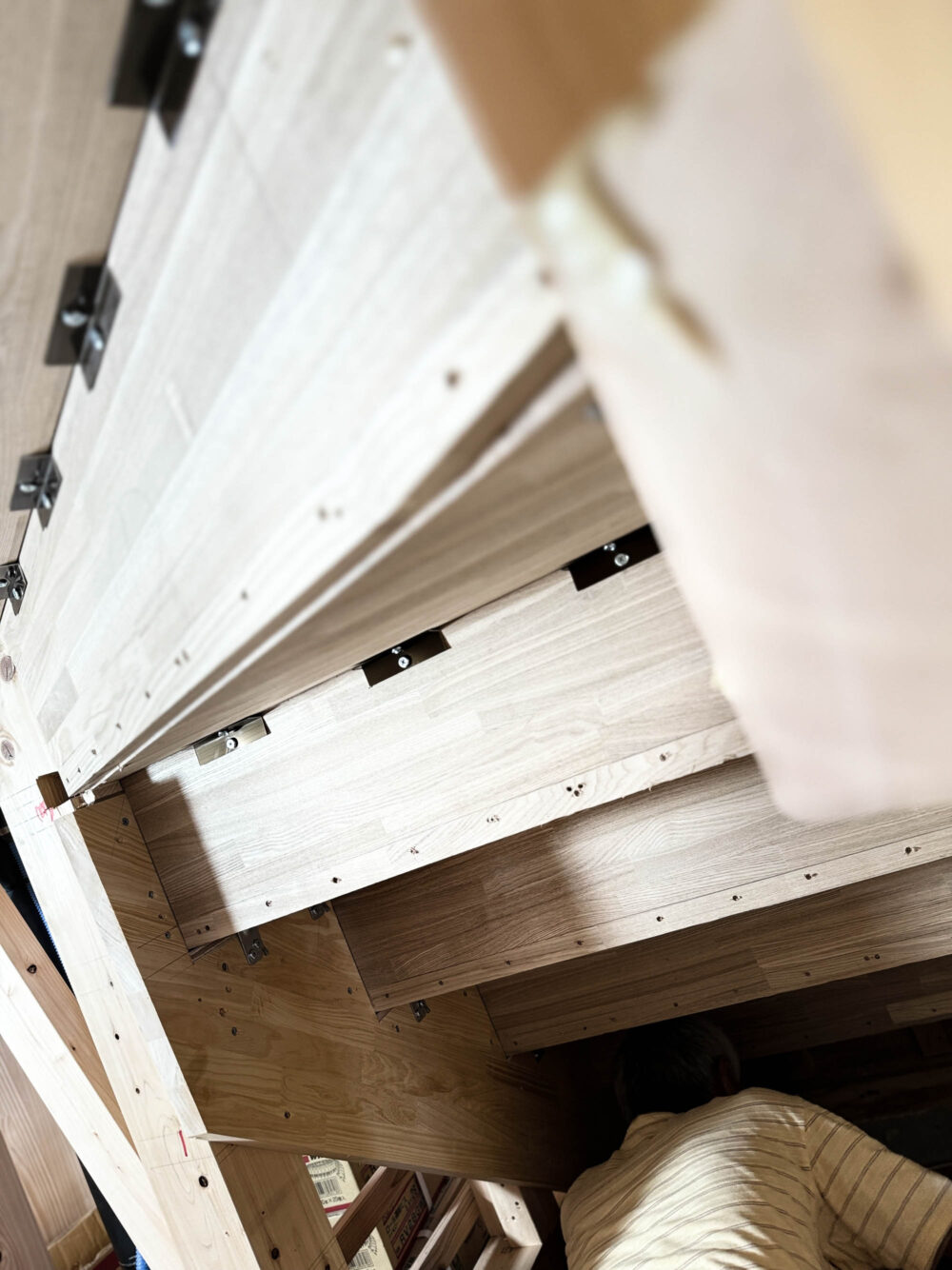 階段の接合部に金具と補強材を丁寧に取り付けることにより構造的な強度を高め、