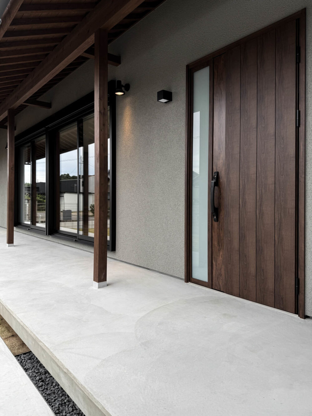 軒とフラットなコンクリートテラスを玄関ポーチから連続させ、建物と外部空間を一体的に構成。