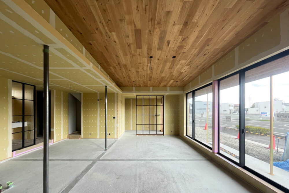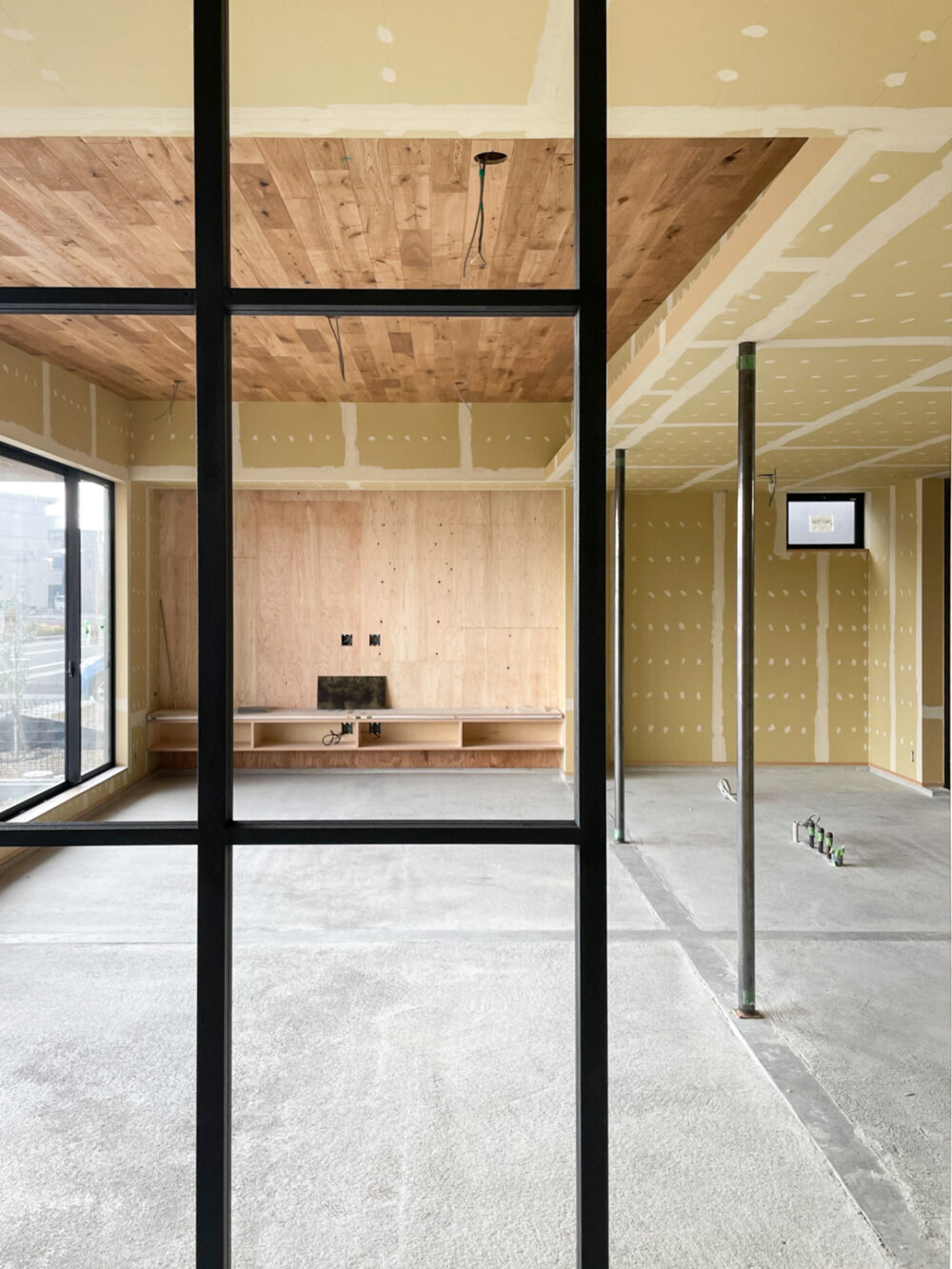 画像はちょうど造作ガレージ部分で、車2台分のボリュームを確保しています。