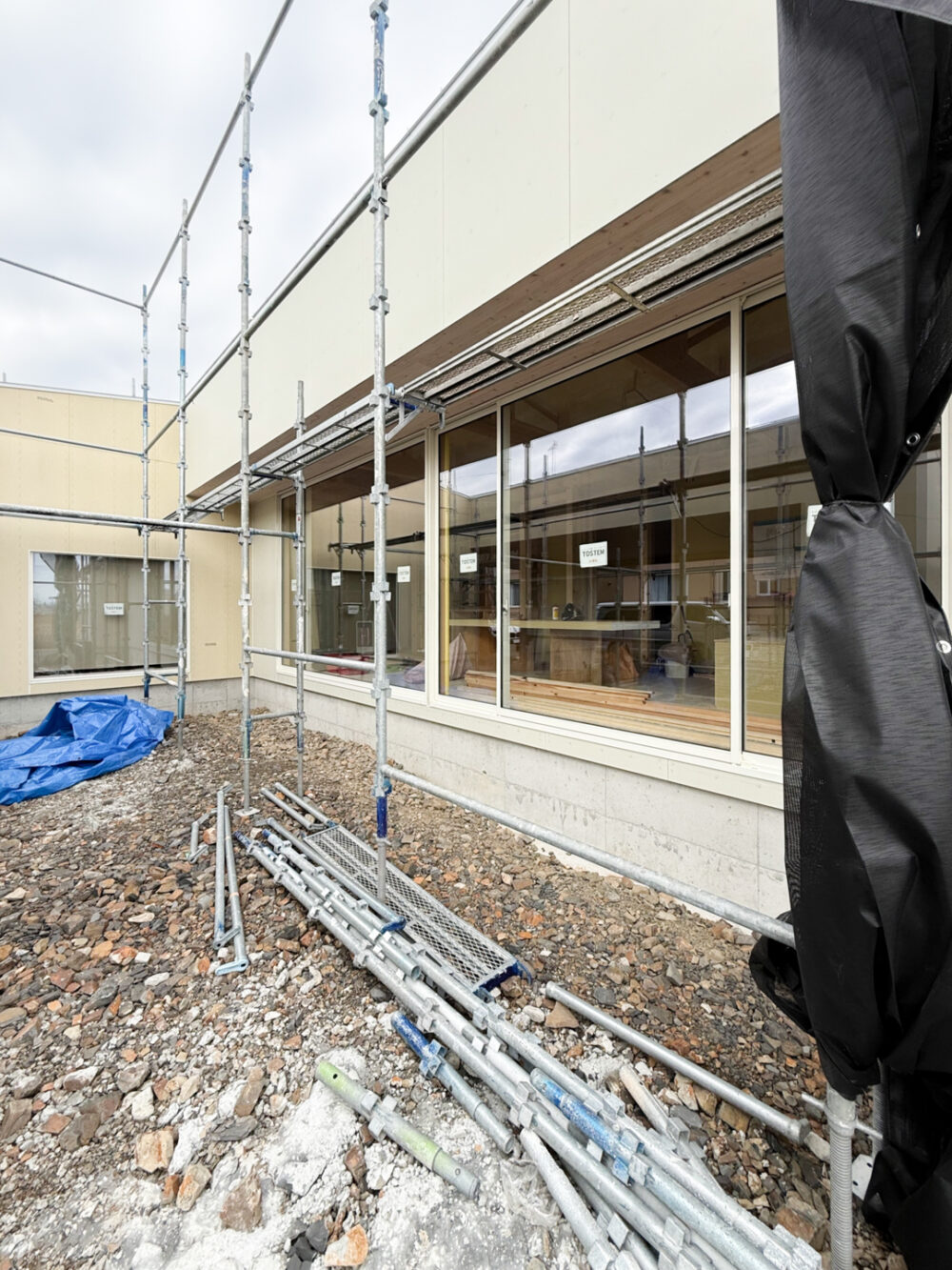 足場と養生ネットに囲まれた現在の状態でも、建物が持つプロポーションや佇まいはすでに明確。