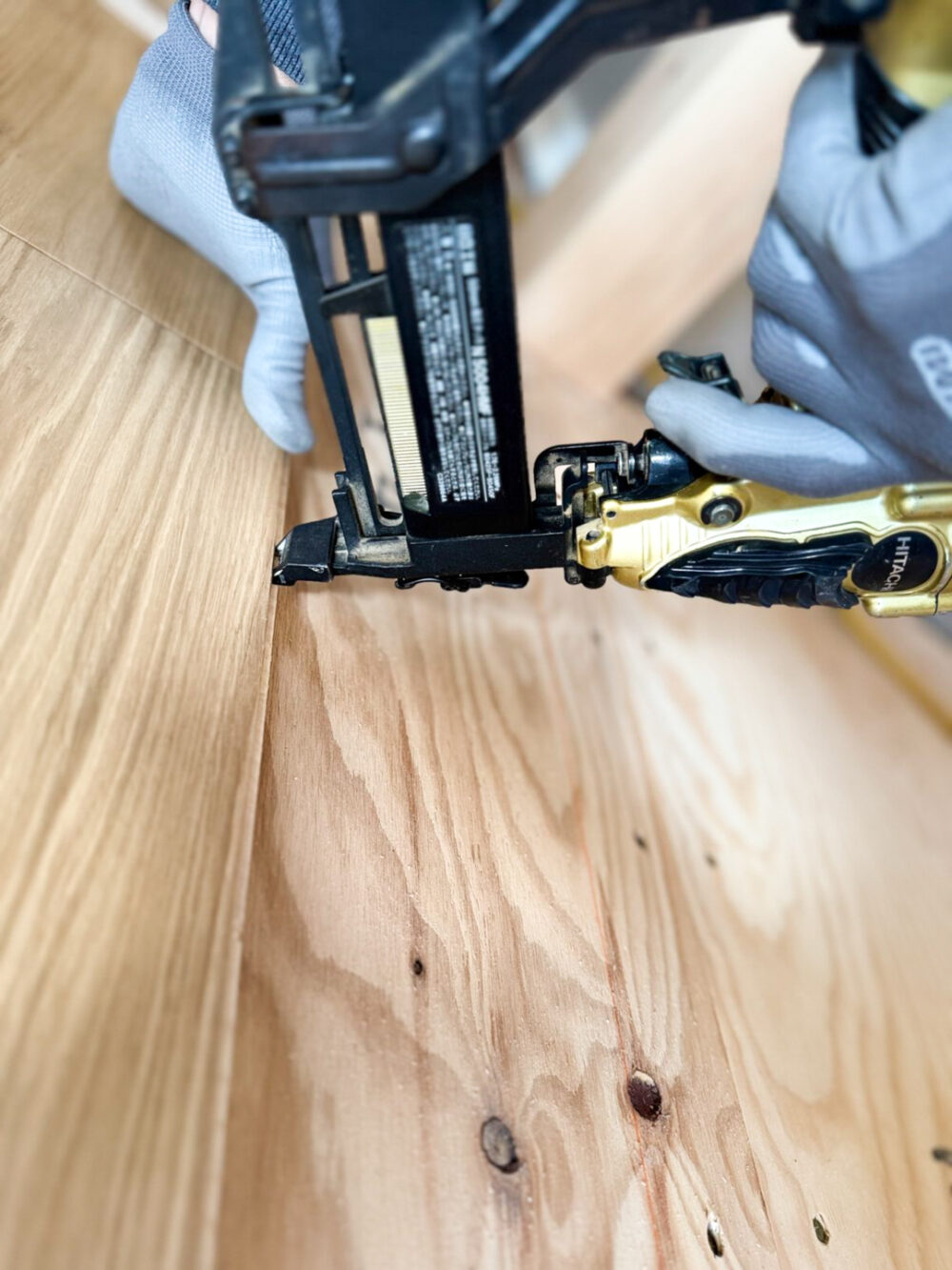 現場で一枚ずつ床材を並べ、全体のバランスを調整したあと固定していきます。